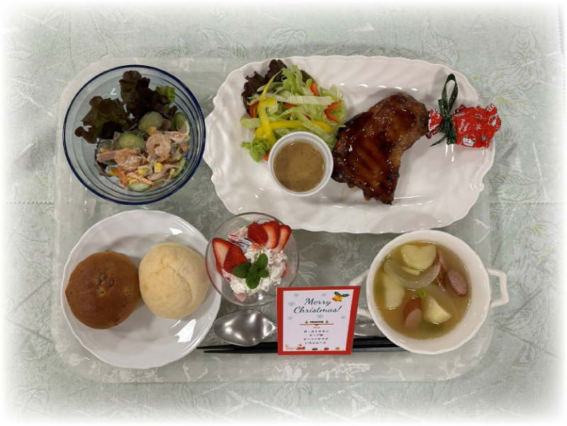 クリスマス 2025年12月25日 12月24日のクリスマスのメニューとして、 〇パン 〇ローストチキン 〇スープ煮 〇ビーフンサラダ 〇いちごのムース を提供しました🎄 12月25日のおやつではチョコケーキを作りました。イチゴで作ったサンタさんが可愛いと患者さんからも喜んでいただけました😊